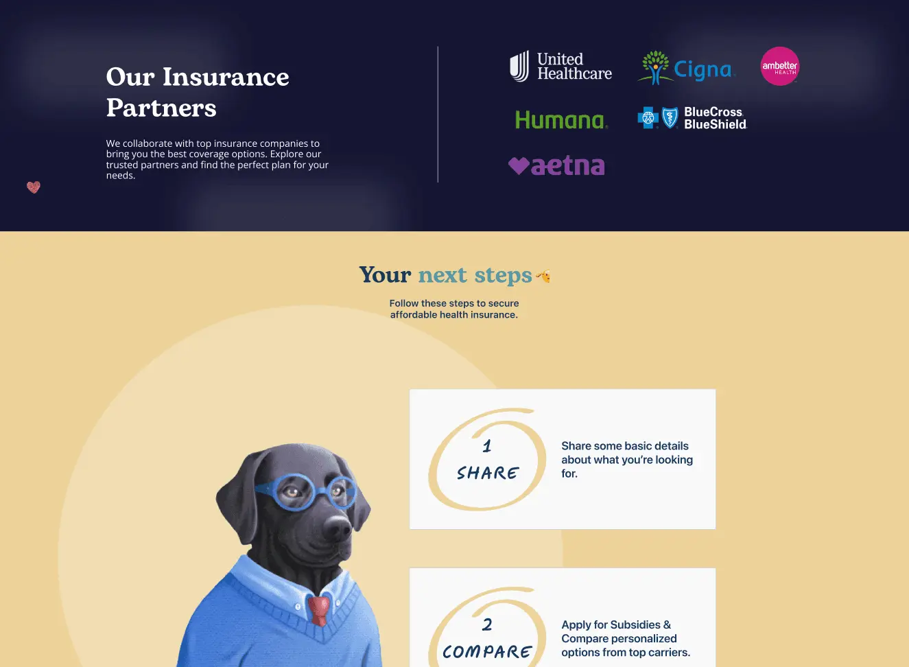 We built a visual and narrative experience rooted in friendliness and reassurance. Through illustrated characters, conversational content and simplified workflows, the platform reduces the intimidation often associated with health insurance. The interface guides users through clear steps—from learning the basics to receiving a quick quote—while maintaining transparency at every stage.